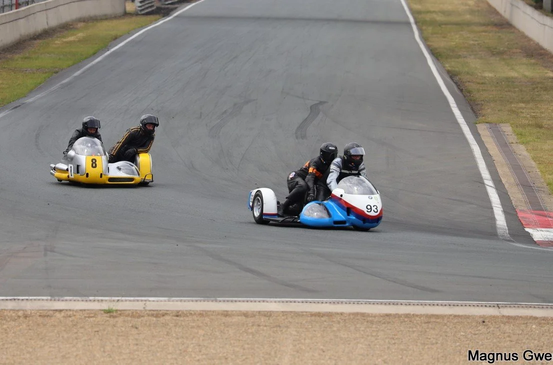 Race 1 With Guido and Zita Reichmuth qualifying in pole and newcomers Jon Perkins and Ian Nickels qualifying in 2nd place and Scott Lawrie and his passenger Kenny Roegiers qualified in 3rd place (just before the race got under way Scott and Kenny pulled off the start line with engine problems causing them to miss race 2 as well). It was a battle up the hill to the first corner with Guido and Zita taking the hole shot and the rest of the pack chasing them hard in this 9 lap race, sadly before the end of lap 2 Ray Reeves and Yens van den Bor had to stop letting Andy Nourish and Michiel Leeflang move up into 3rd place and with Kobus Bouman and Nicolai Klinker also dropping out later in the race, this left the first 3 as Guido and Zita followed by Jon and Ian with Andy and Michiel picking up 3rd.